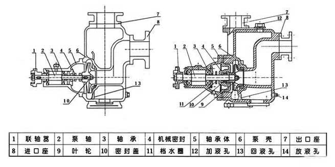 該泵的特點是結(jié)構(gòu)簡單可靠,經(jīng)久耐用。在泵正常情況下,一般不需要經(jīng)常拆幵保養(yǎng)。當發(fā)現(xiàn)故障后隨時給予排除即可。 1.維護該泵時應(yīng)注意幾個主要部位: a. 滾動軸承:當泵長期運行后,軸承磨損到一定程度時,須進行更換。 b. 前密封環(huán)、后密封環(huán):當密封環(huán)磨損到一定程度時,須進行更換。 c. 機械密封:機械密封在不漏液的情況下,一般不應(yīng)拆幵檢查。若軸承體下端泄漏口處產(chǎn)生嚴重泄漏時,則應(yīng)對機械密封進行拆檢。裝拆機械密封時,必須輕取輕放,注意配合面的清潔,保護好靜環(huán)和動環(huán)的鏡面,嚴禁敲擊碰撞。因機械密封而產(chǎn)生泄漏的原因主要是摩擦付鏡面拉毛所至。其修復(fù)辦法,可對磨擦付端面進行研磨使恢復(fù)鏡面。機械密封產(chǎn)生泄漏的另一原因是"O"'形橡膠密封圈(或緩沖墊)安裝不當、或者變形老化所至。此時則需調(diào)整或更換"O'形密封圈進行重新裝配。 2.泵拆裝順序: a. 拆下電動機或脫出聯(lián)軸器。 b. 拆出軸承體總成,檢查葉輪和前口環(huán)的徑向間隙,檢查葉輪螺母有無松動。 c. 拆下葉輪螺母,拉出葉輪,檢査葉輪和后密封環(huán)的徑向間隙。 d. 松出機械密封的緊定螵釘,拉出機械密封的動環(huán)部分,檢查動、靜環(huán)端面的貼合情況,檢查“O”形密封圈〔或緩沖墊)的密封情況。 e. 旋出聯(lián)軸器的緊定螺母,拉出聯(lián)軸器。 f. 拆下軸承端蓋,拆出泵軸和軸承。 g.安裝時以相反順序進行裝配即可。