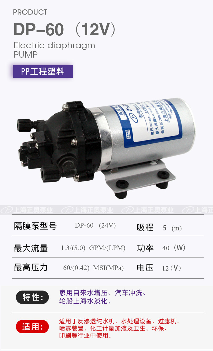 DP微型電動隔膜泵適用于家用自來水增壓、汽車沖洗、輪船上海水淡化,DP隔膜泵適用于反滲透純水機(jī)、水處理設(shè)備、過濾機(jī)、噴霧裝置、化工計(jì)量加液及衛(wèi)生、環(huán)保、印刷等行業(yè)中使用。