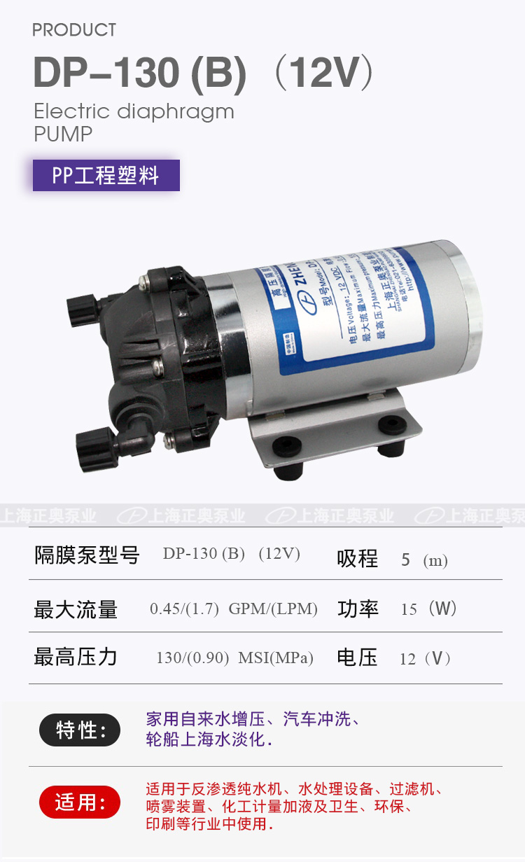 DP微型電動(dòng)隔膜泵適用于家用自來(lái)水增壓、汽車(chē)沖洗、輪船上海水淡化,DP隔膜泵適用于反滲透純水機(jī)、水處理設(shè)備、過(guò)濾機(jī)、噴霧裝置、化工計(jì)量加液及衛(wèi)生、環(huán)保、印刷等行業(yè)中使用。