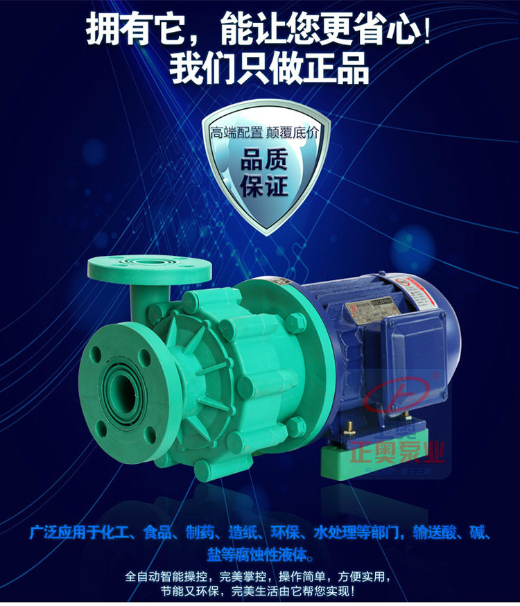 正奧公司生產(chǎn)的101型、102型、103型、104型、105型泵系單吸直聯(lián)式塑料離心泵是一種小型塑料泵,產(chǎn)品結(jié)構(gòu)、體積小、重量輕、耗電省、耐酸堿、密封好、維修方便。FS型工程塑料離心泵系列產(chǎn)品均采用機械密封,并引進國際工藝和技術(shù)配方,全使用改性ABS(工程塑料)作為泵的材質(zhì),在同系列的塑料泵產(chǎn)品中,充分顯示了其結(jié)構(gòu)重量輕、體積小、壽命長等特點,廣泛應(yīng)用于化工,食品、制藥、電鍍、造紙、環(huán)保、水處理等部門,輸送酸、堿、鹽等腐蝕性液體。其中104型采用220V電壓,可供家庭選用。