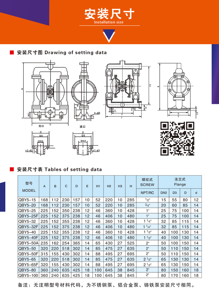 正奧公司生產(chǎn)的隔膜泵共有十二種規(guī)格。進(jìn)出口尺寸分別為1/4”(10mm)、1/2”(15mm)、3/4”(20mm)、1”(25mm)、1.2”(32mm)1.5”(40mm)、2”(50mm)、2.5”(65mm)3”(80mm)、4”(100mm)流體部件材質(zhì)有:鋁合金、鑄鐵、聚丙烯、不銹鋼、隔膜根據(jù)不同膜片材質(zhì)分別有:丁晴橡膠、氯丁橡膠、聚乙烯、聚膠、聚醚橡膠、氟橡膠、氟塑料、特氟隆。以滿(mǎn)足不同液體介質(zhì)的需要。