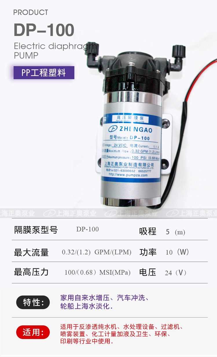 DP微型電動隔膜泵適用于家用自來水增壓、汽車沖洗、輪船上海水淡化,DP隔膜泵適用于反滲透純水機、水處理設(shè)備、過濾機、噴霧裝置、化工計量加液及衛(wèi)生、環(huán)保、印刷等行業(yè)中使用。