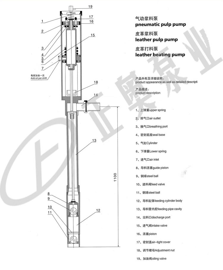 正奧氣動漿料泵產(chǎn)品采用氣壓差的作用,使活塞上下運行,帶動導(dǎo)料活塞開閉,起到提料的作用。 具體裝置如圖(一)所示: 1、缸體 2、進氣閥 3、彈簧 4、彈簧 5、活塞 6、排氣管 7、換氣管 8、密封底座 9、密封上蓋 10、漿料缸體 11、進料口 12、漿料活塞 13、進料鋼球 14、鋼球 15、連桿 16、漿料管 17、出料口 18、加油閥 19、放氣閥