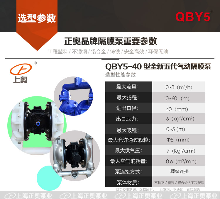 QBY5-F型氣動隔膜泵是我公司開的第五代氣動隔膜泵,無油氣動隔膜泵,高吸程大流量隔膜泵,國內的氣動隔膜泵并對性能的進一步加強,效率更高;歡迎選擇上奧牌氣動隔膜泵。