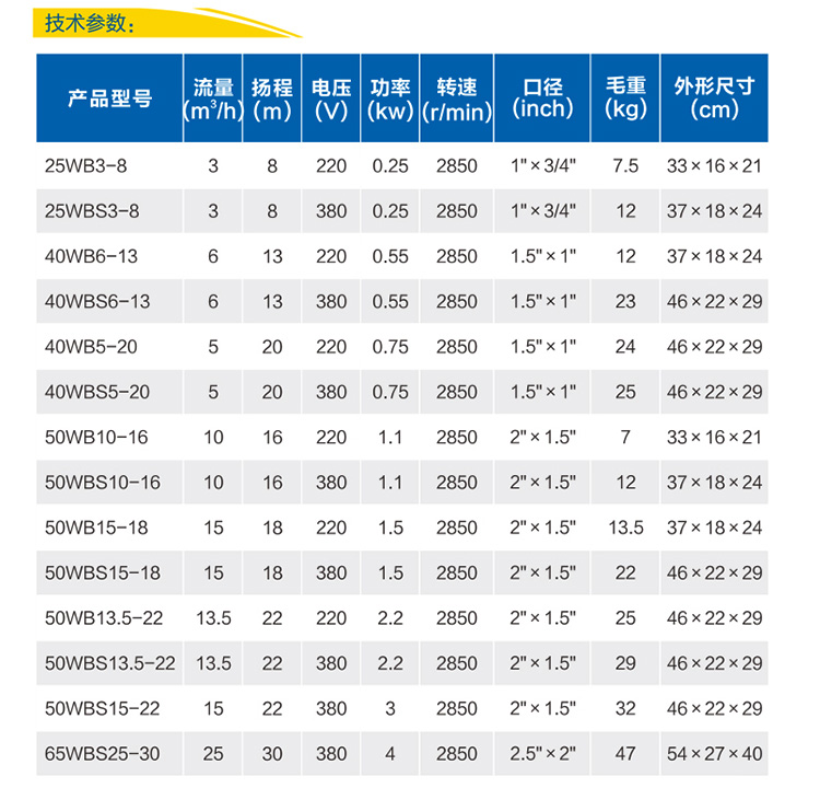 | 產(chǎn)品型號(hào) | 最大流量(m3/h) | 最高揚(yáng)程(m) | 額定功率(kW) | 電壓(V) | 口徑(mm) | 毛重(kg) | 包裝尺寸(cm3) |